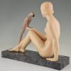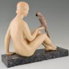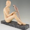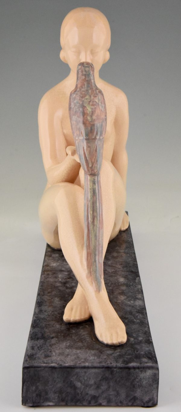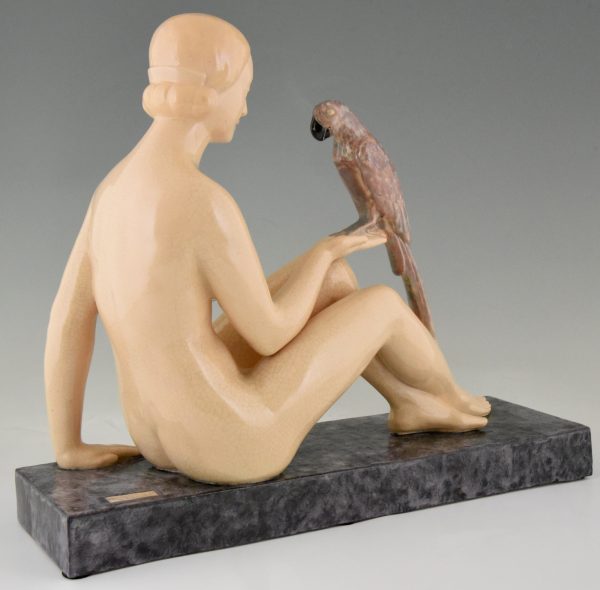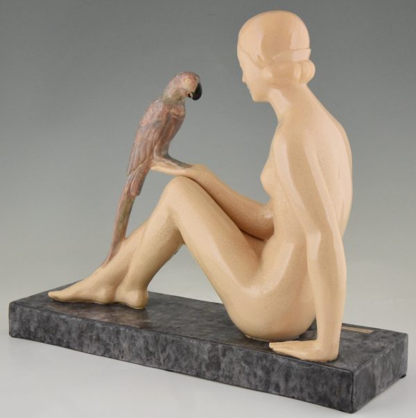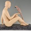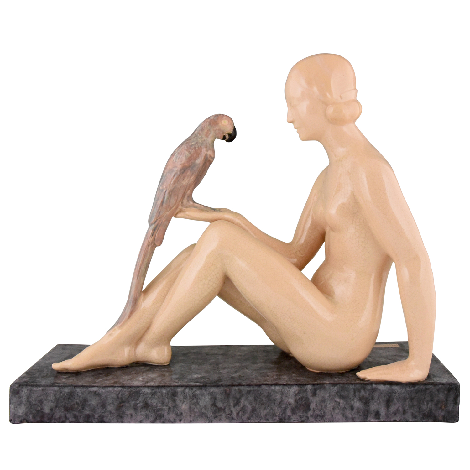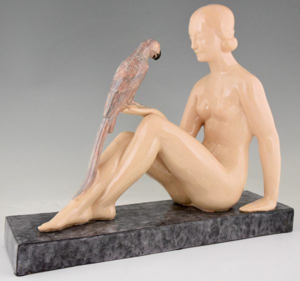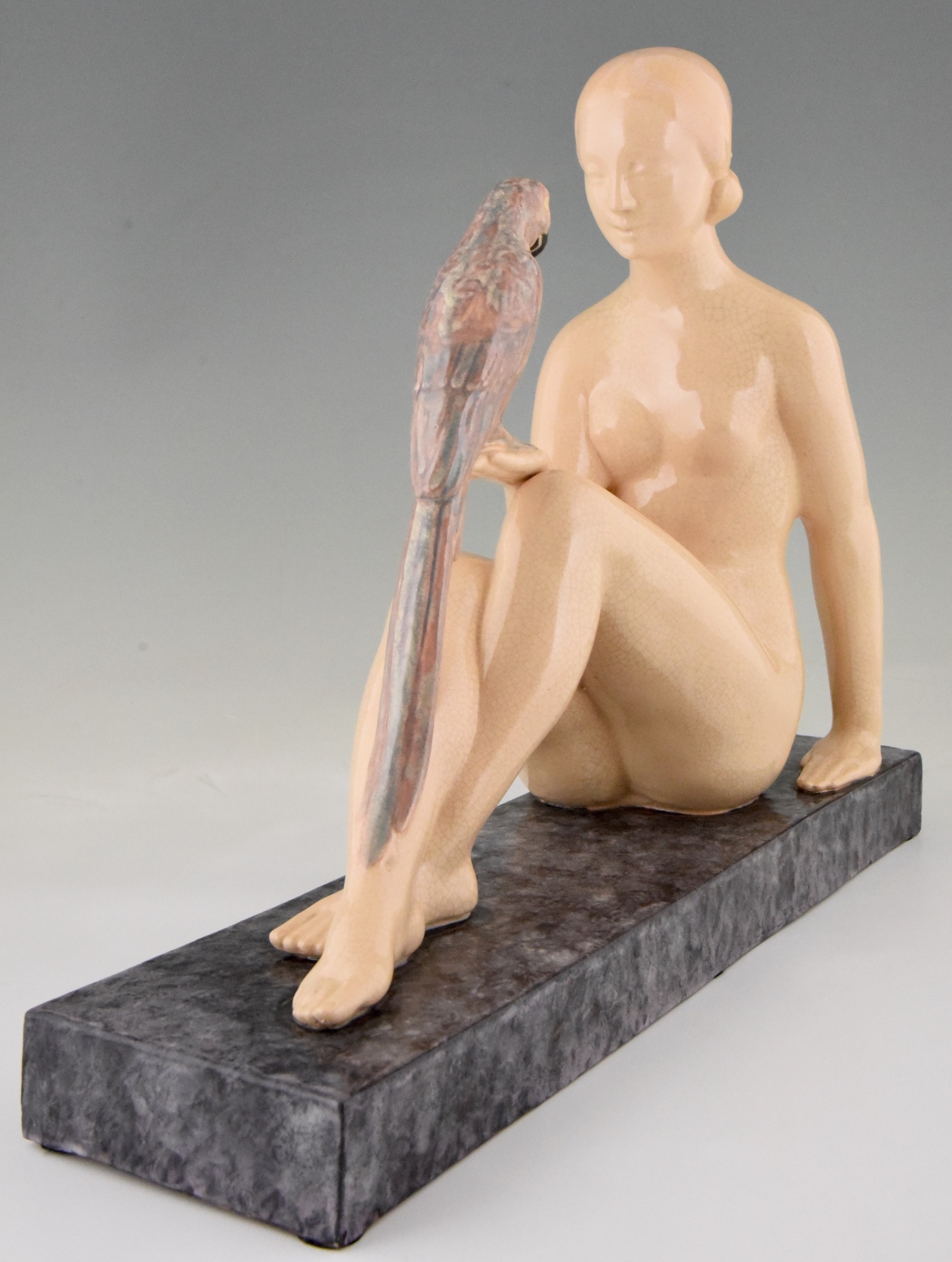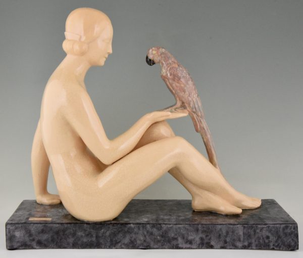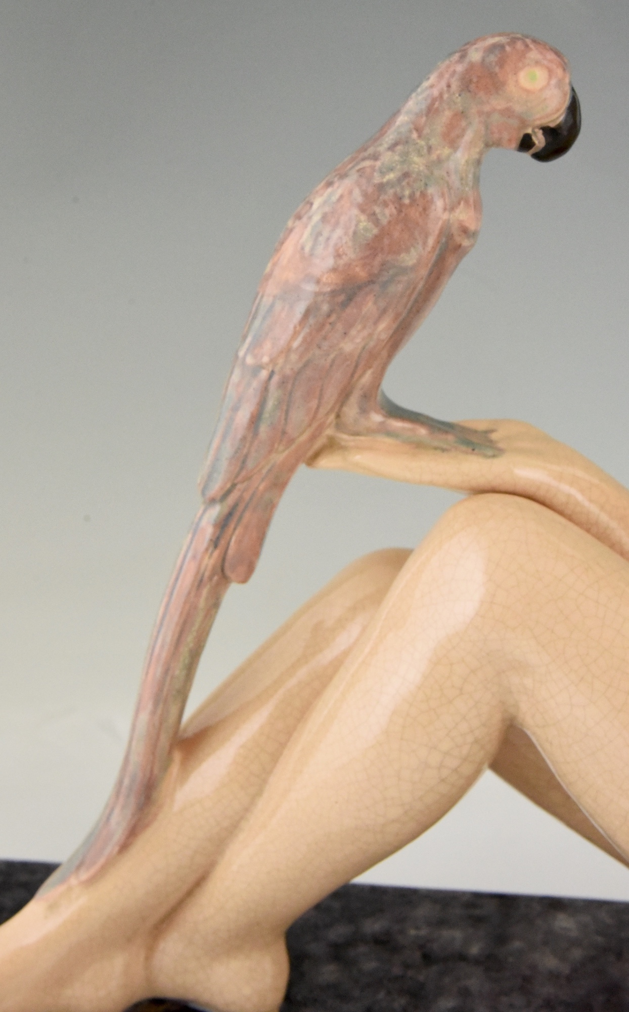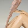 Art Deco sculptuur keramiek naakte vrouw met papegaai