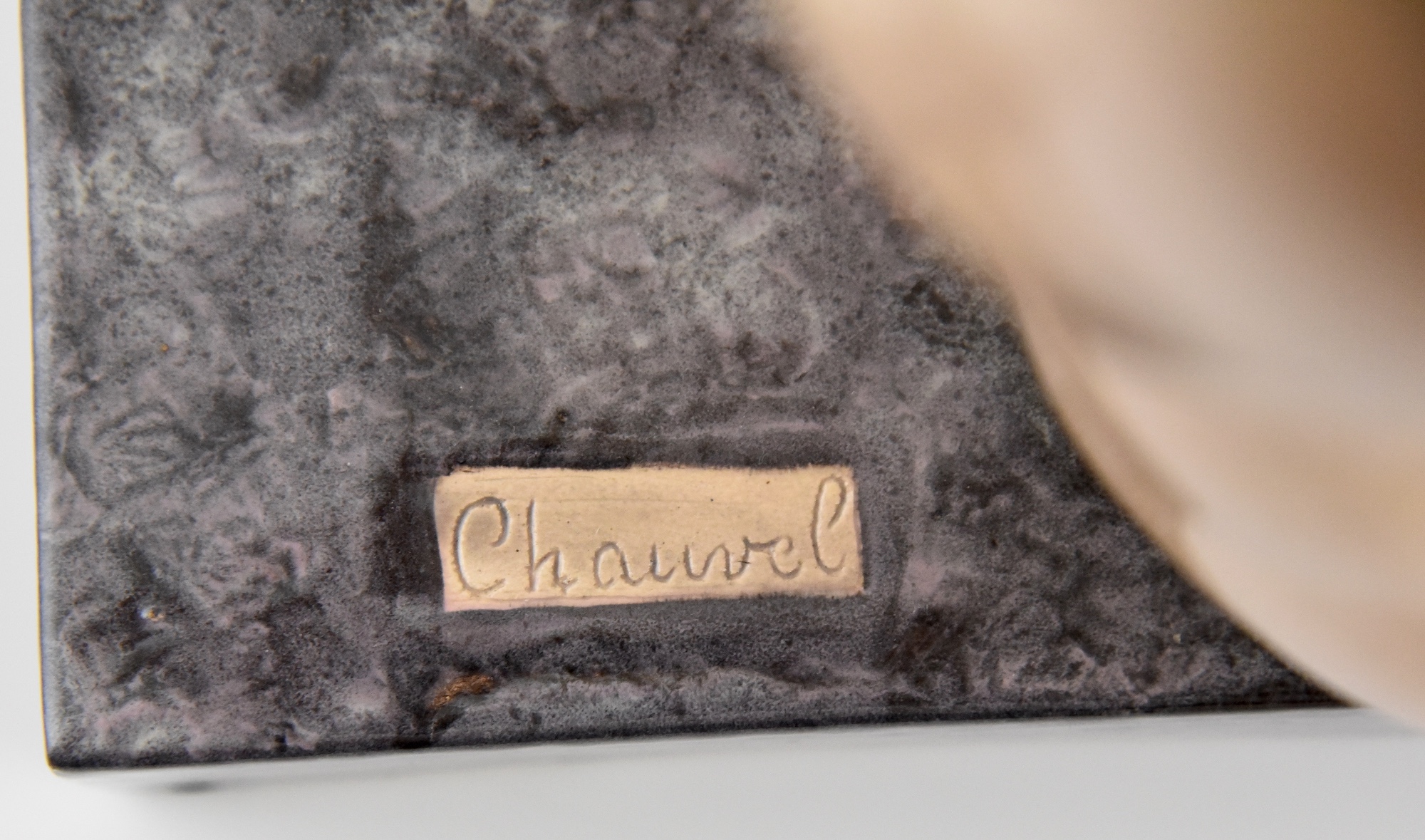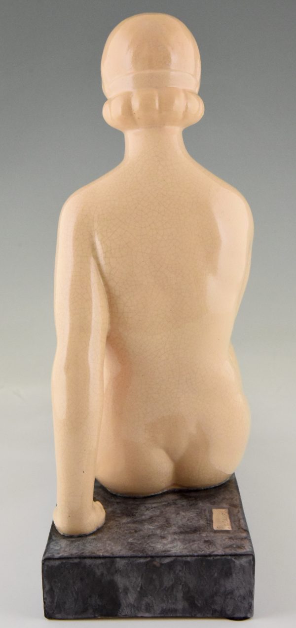 Art Deco ceramic sculpture of a seated nude lady holding a parrot by the French sculptor Georges Chauvel (1886-1962) Beautiful pastel colors, cream, pink and purple. Ca. 1930.