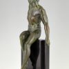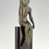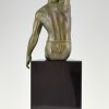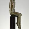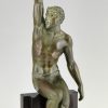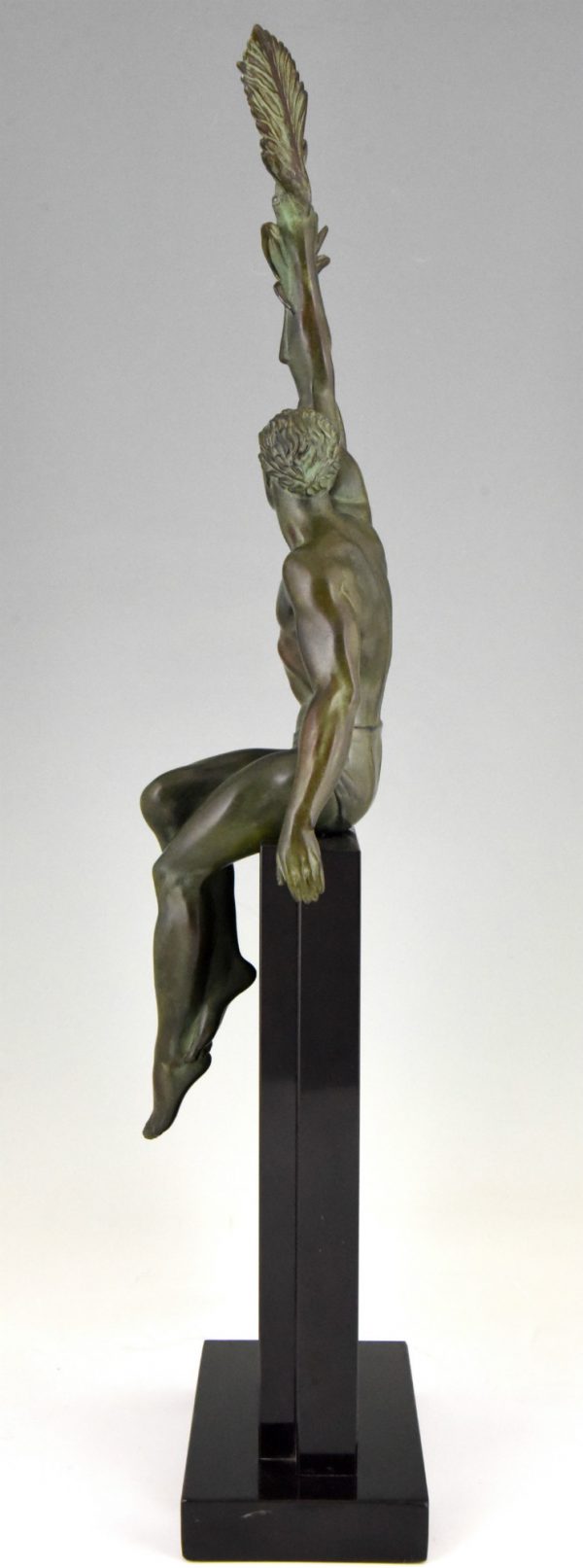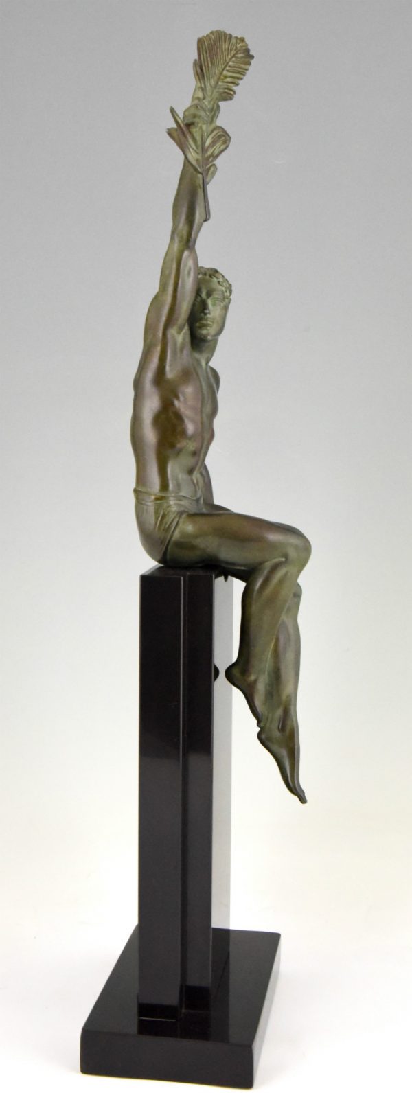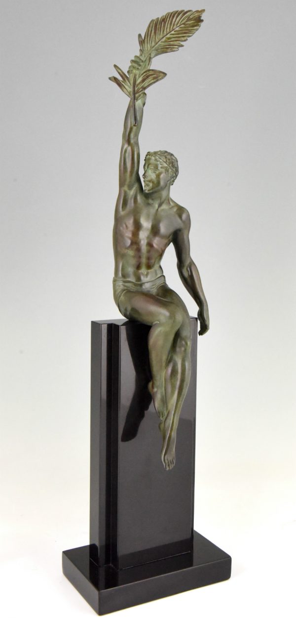Athletic man with palm leaf, Art Deco sculpture Victory by Pierre Le Faguays, France 1930. Art metal with green patina on Belgian Black marble base.