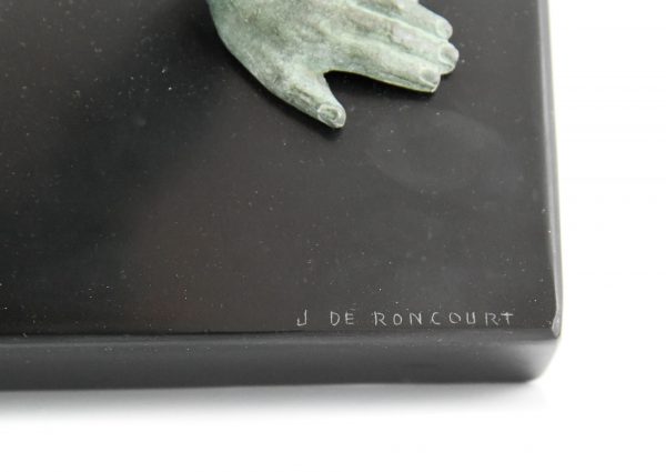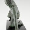 The sculpture has a beautiful green patina with lighter shades and stands on a Belgian Black marble plinth.