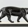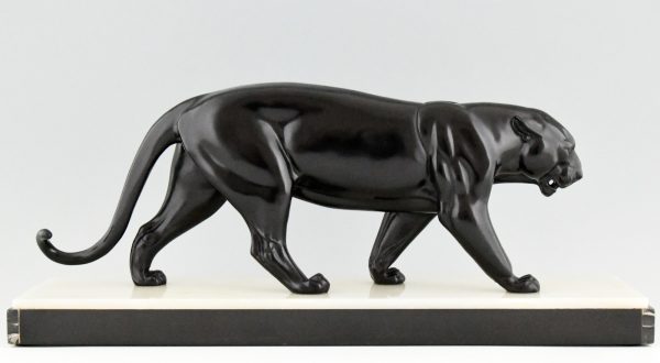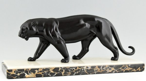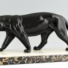 Art Deco sculpture of a walking panther signed by the well known French sculptor Irenee Rochard. The sculpture has a beautiful black patina and stands on a portor marble and onyx base, ca. 1930.