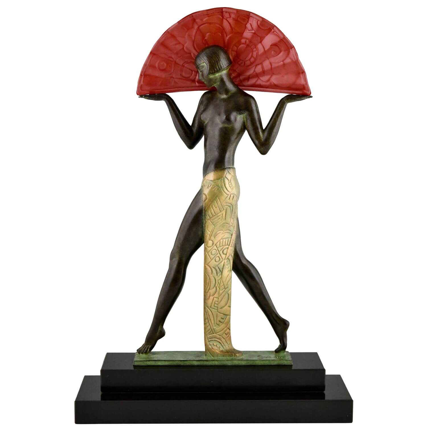 Deze indrukwekkende Art Deco tafellamp genaamd Lumina is ontworpen in 1928 door de beroemde Franse beeldhouwer Max Le Verrier. De lamp toont een staande naakte vrouw die een glazen kap van craquelé-glas omhooghoudt – een icoon van de gestileerde elegantie van de Art Deco-periode.