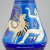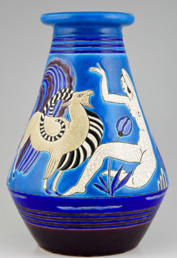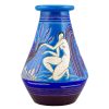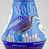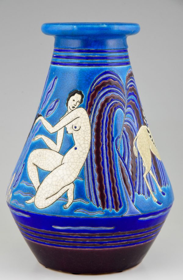 “Aux Baigneuses” a fine Longwy Primavera Art Deco vase with 2 bathing nudes, peacock and ibex in shades of blue, purple, black and white.