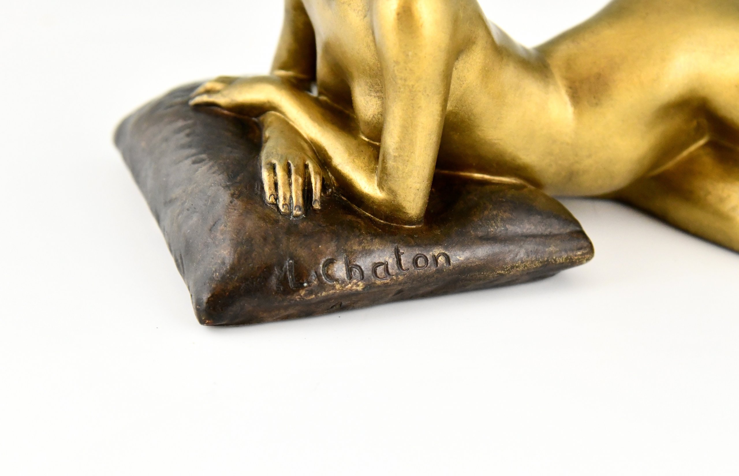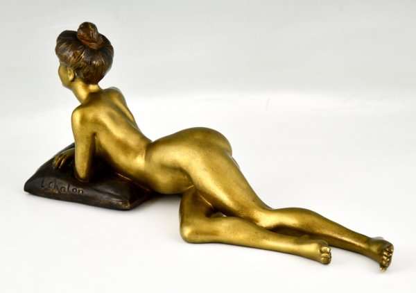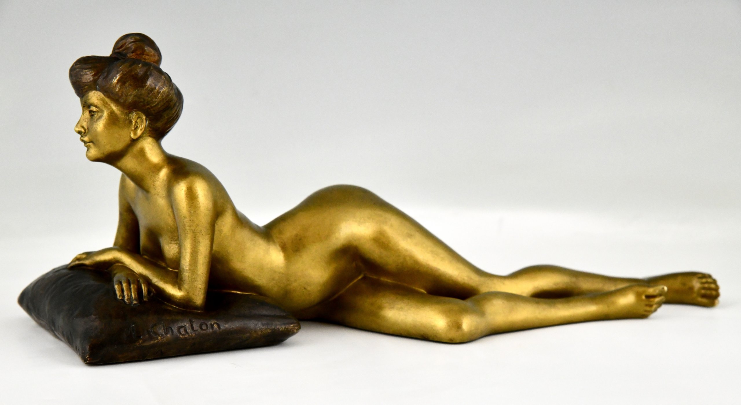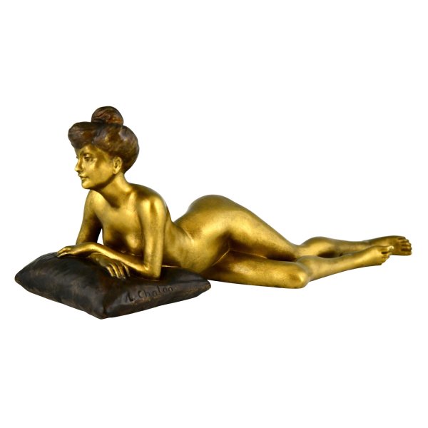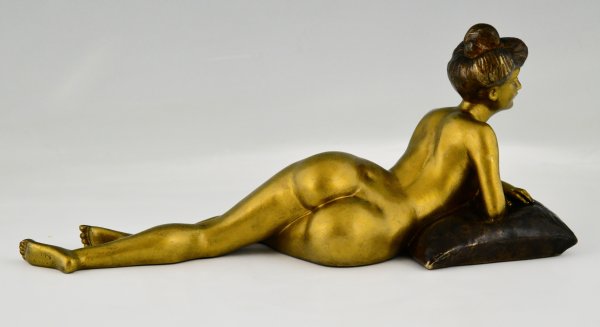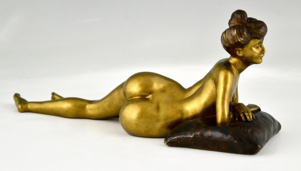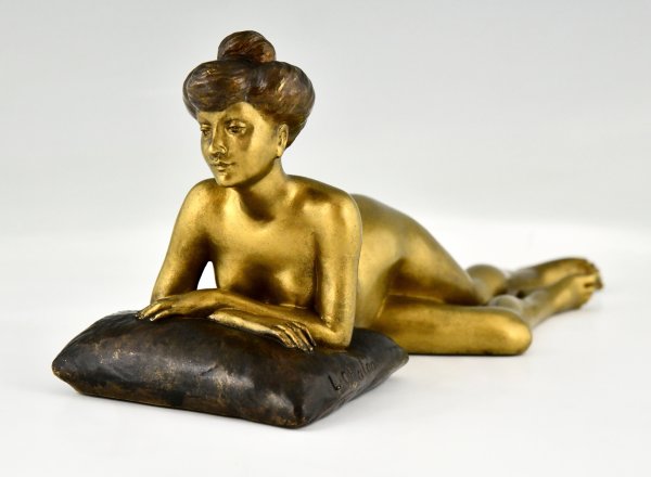 Art Nouveau erotische bronzen sculptuur liggend naakt op een kussen van Louis Chalon met Goldscheider gieterijstempel.