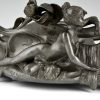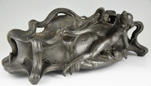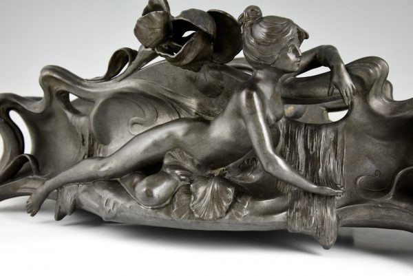 Impressive Art Nouveau pewter flowerdish with nude and irisses signed by Auguste Moreau, France 1900.