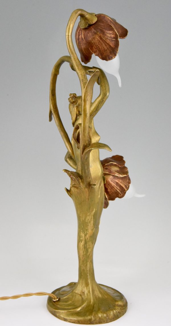 Beautiful bronze Art Nouveau lamp with a semi nude lady holding two flowers signed by the French brothers Louis and François Moreau, circa 1900.