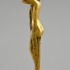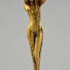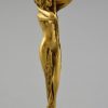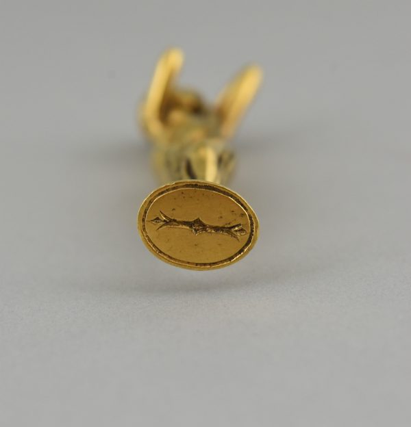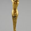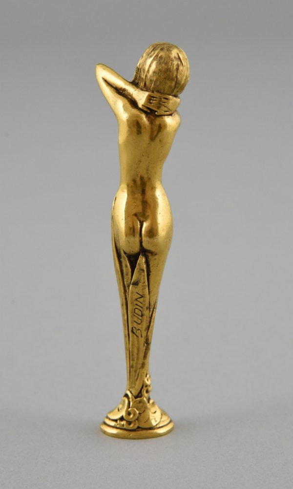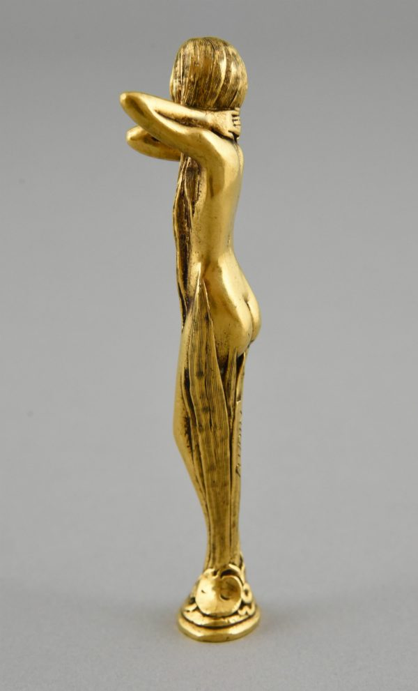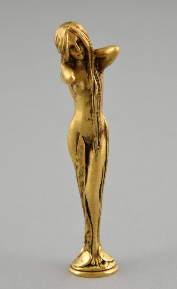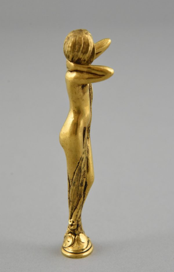 Art Nouveau letter wax seal stamp in the shape of a nude with long hair by Budin. The base is decorated with leaves.