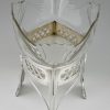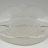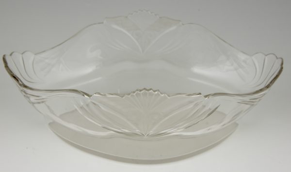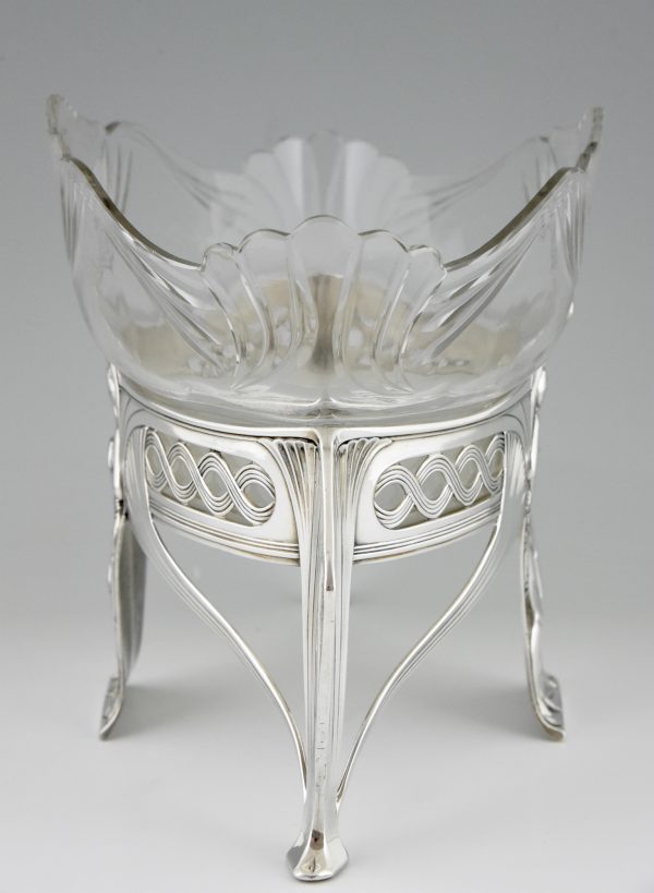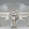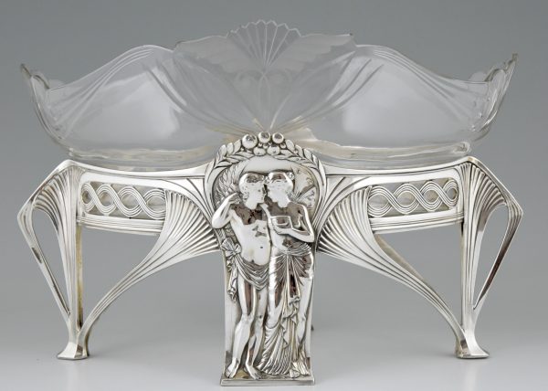 An Art Nouveau flower dish decorated with romantic semi nude couple and leaves and finely cut glass liner.